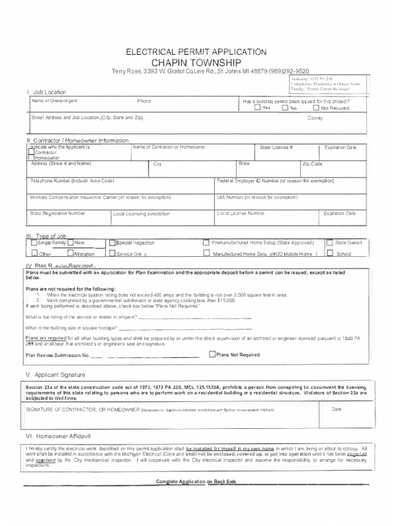 ELECTRICAL PERMIT APPLICATIONCHAPIN TOWNSHIPTerry Rose, 3393 W. Gratiot Co\' Line Rd., St. Johns MI 48879 (989)2929520I. Job Location Name of OwneriAgentIPhoneStreet Address and Job Location (City,