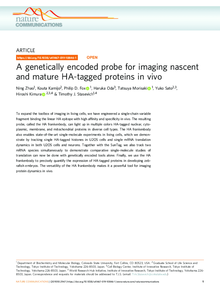 ARTICLE https://doi.org/10.1038/s41467019108461OPENA genetically encoded probe for imaging nascent and mature HAtagged proteins in vivo1234567890():,;Ning Zhao1, Kouta Kamijo2, Philip D. Fox 1, Haruka Oda3, Tatsuya Morisaki Hiroshi Kimura 2,3,4 & Timothy J. Stasevich1,41,Yuko Sato2,3,To expand the toolbox of imaging in living cells, we have engineered a singlechain variable fragment binding the linear HA epitope with high afnity and specicity in vivo. The resulting probe,