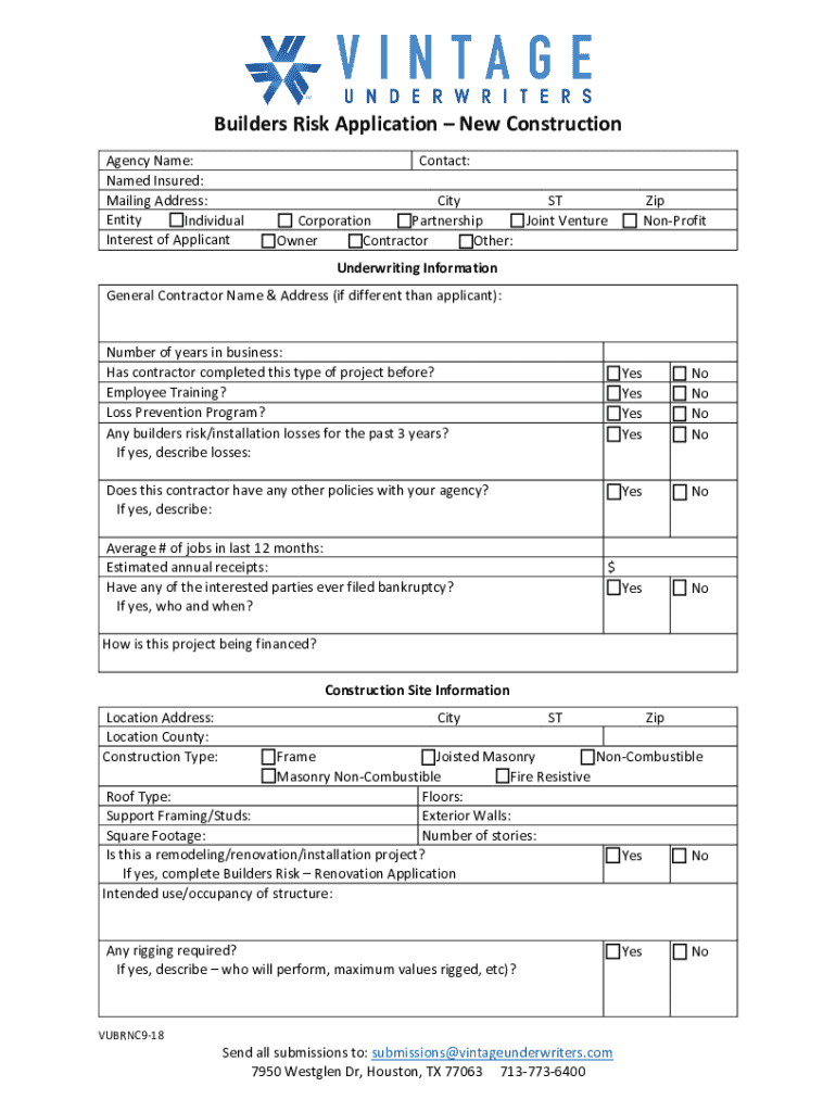 Builders Risk Application New Construction Agency Name: Named Insured: Mailing Address: Entity Individual Interest of ApplicantContact: City ST Corporation Partnership Joint Venture Owner Contractor Other:Zip NonProfitUnderwriting Information General Contractor Name & Address (if different than applicant):Number of years in business: Has contractor completed this type of project before? Employee Training? Loss Prevention Program? Any builders risk/installation