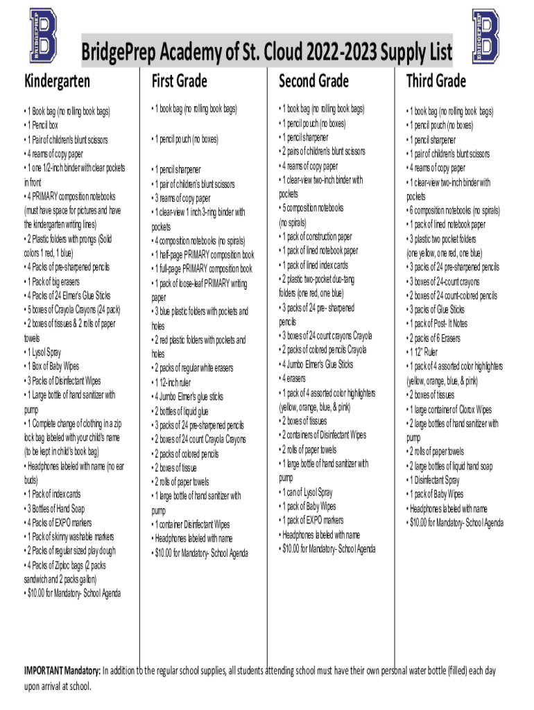 BridgePrep Academy of St. Cloud 20222023 Supply List KindergartenFirst GradeSecond GradeThird Grade 1 Book bag (no rolling book bags) 1 Pencil box 1 Pair of children\'s blunt scissors 4 reams of copy paper 1 one 1/2inch binder with clear pockets in front 4 PRIMARY composition notebooks (must have space for pictures and have the kindergarten writing lines) 2 Plastic folders with prongs (Solid colors 1 red, 1 blue) 4 Packs of presharpened pencils 1 Pack