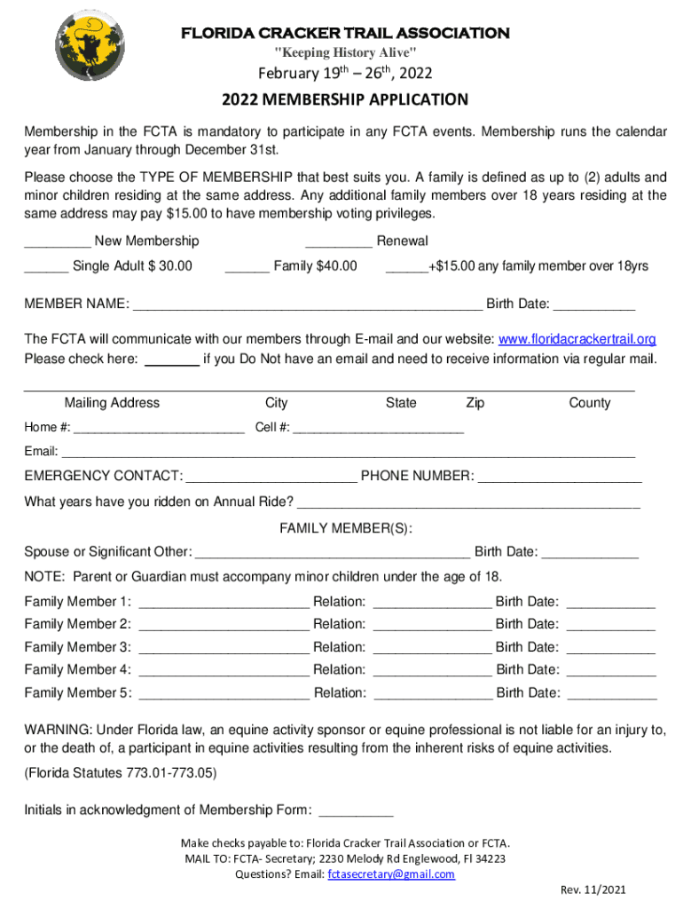 Get the free Annual Ride RegistrationFlorida Cracker Trail Association