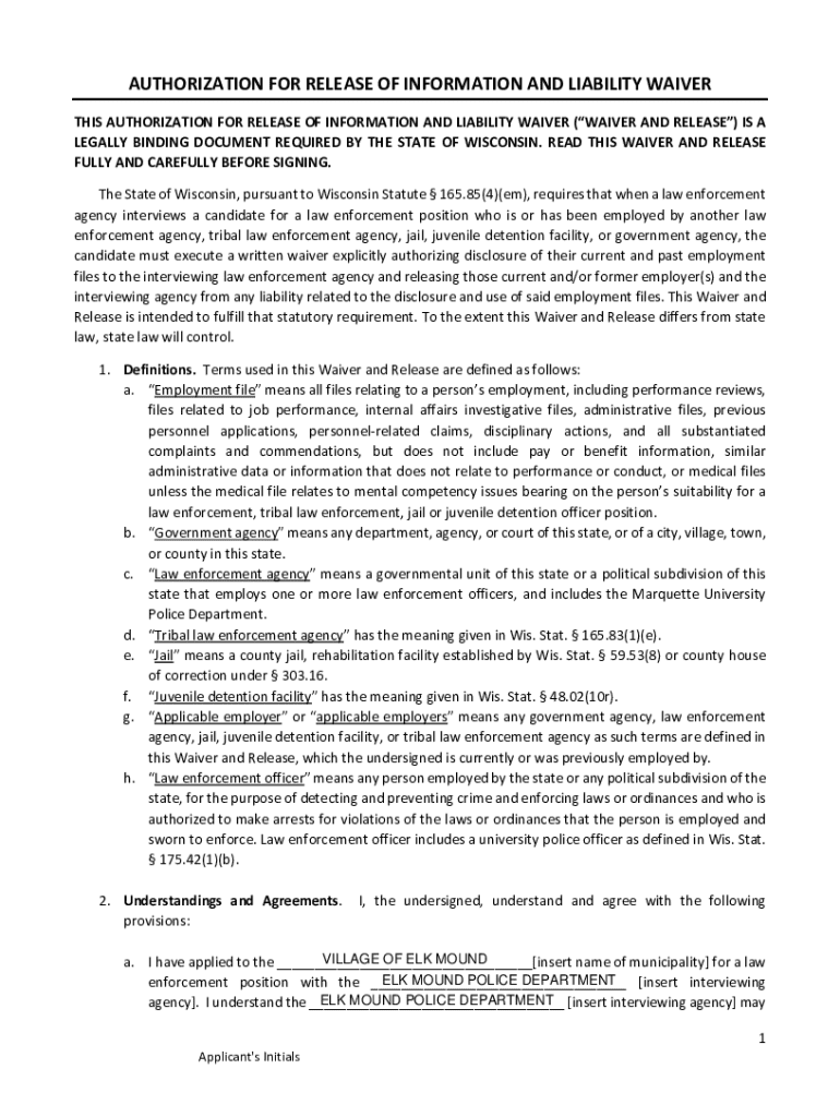 AUTHORIZATION FOR RELEASE OF INFORMATION AND LIABILITY WAIVER THIS AUTHORIZATION FOR RELEASE OF INFORMATION AND LIABILITY WAIVER (WAIVER AND RELEASE) IS A LEGALLY BINDING DOCUMENT REQUIRED BY THE STATE OF WISCONSIN. READ THIS WAIVER AND RELEASE FULLY AND CAREFULLY BEFORE SIGNING. The State of Wisconsin, pursuant to Wisconsin Statute 165.85(4)(em), requires that when a law enforcement agency interviews a candidate for a law enforcement position who is or has been employed by another law...