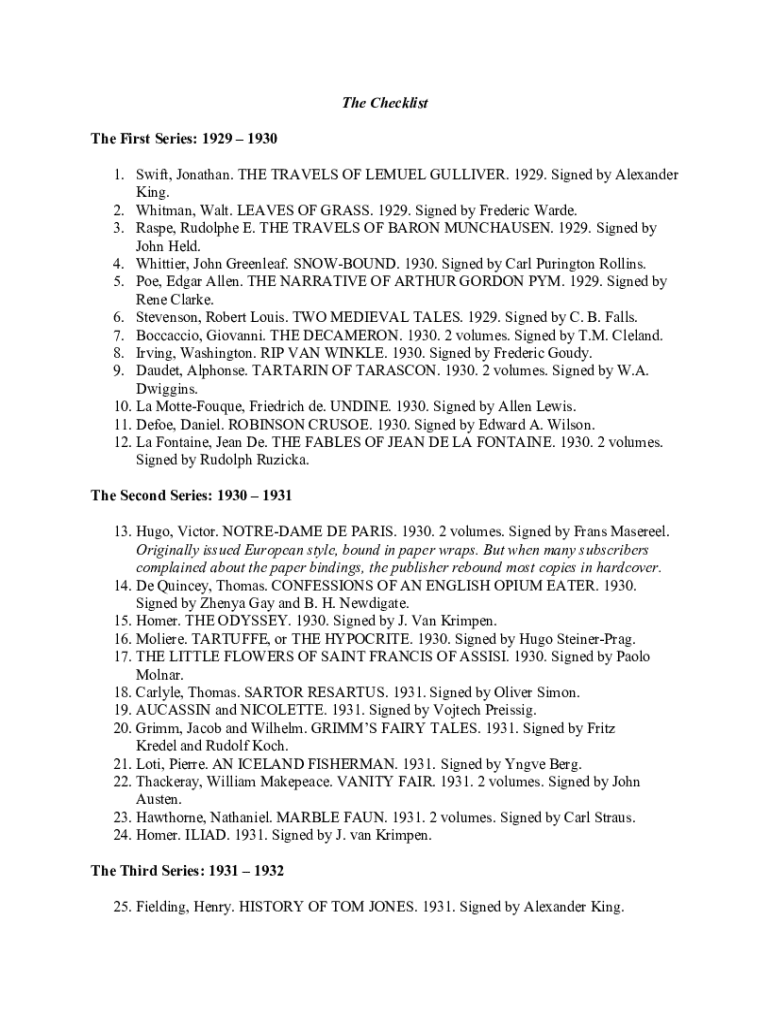 The Checklist The First Series: 1929 1930 1. Swift, Jonathan. THE TRAVELS OF LEMUEL GULLIVER. 1929. Signed by Alexander King. 2. Whitman, Walt. LEAVES OF GRASS. 1929. Signed by Frederic Warde. 3. Raspe, Rudolphe E. THE TRAVELS OF BARON MUNCHAUSEN. 1929. Signed by John Held. 4. Whittier, John Greenleaf. SNOWBOUND. 1930. Signed by Carl Purington Rollins. 5. Poe, Edgar Allen. THE NARRATIVE OF ARTHUR GORDON PYM. 1929. Signed by Rene Clarke. 6. Stevenson, Robert Louis. TWO MEDIEVAL TALES. 1929....