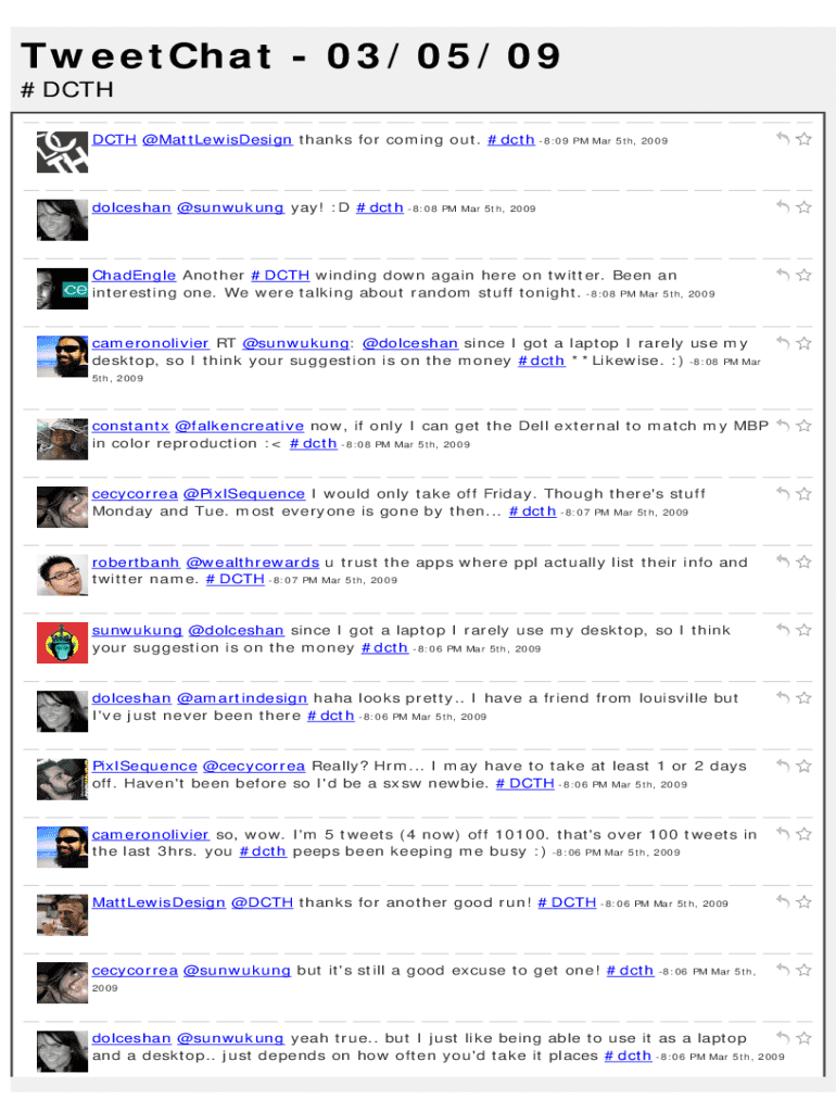 file:///C|/MichaelConatyDotCom/DCTH.htmTweetChat 03/05/09 #DCTH DCTH @MattLewisDesign thanks for coming out. #dcth 8:09 PM Mar 5th, 2009dolceshan @sunwukung yay! :D #dcth 8:08 PM Mar 5th, 2009ChadEngle Another #DCTH winding down again here on twitter. Been an interesting one. We were talking about random stuff tonight. 8:08 PM Mar 5th, 2009cameronolivier RT @sunwukung: @dolceshan since I got a laptop I rarely use my desktop, so I think your suggestion is on the money #dcth **Likewise