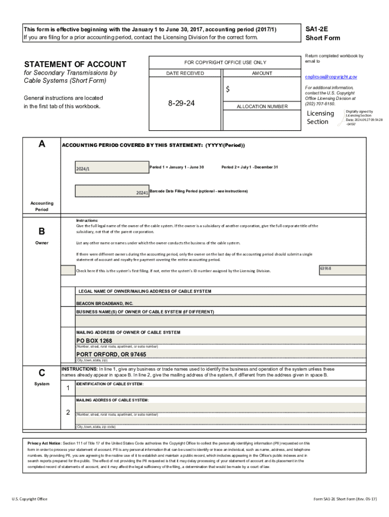 This form is effective beginning with the January 1 to June 30, 2017, accounting period (2017/1) If you are filing for a prior accounting period, contact the Licensing Division for the correct form.STATEMENT OF ACCOUNTFOR COPYRIGHT OFFICE USE ONLYfor Secondary Transmissions by Cable Systems (Short Form)DATE RECEIVED$General instructions are located82924in the first tab of this workbook.AAMOUNTALLOCATION NUMBERSA12E Short Form Return completed workbook by email tocoplicsoa@copyright