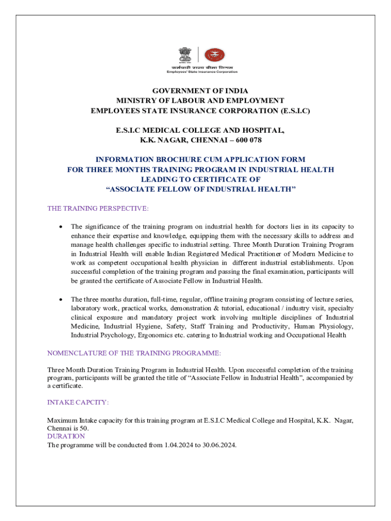 GOVERNMENT OF INDIA MINISTRY OF LABOUR AND EMPLOYMENT EMPLOYEES STATE INSURANCE CORPORATION (E.S.I.C) E.S.I.C MEDICAL COLLEGE AND HOSPITAL, K.K. NAGAR, CHENNAI 600 078 INFORMATION BROCHURE CUM APPLICATION FORM FOR THREE MONTHS TRAINING PROGRAM IN INDUSTRIAL HEALTH LEADING TO CERTIFICATE OF ASSOCIATE FELLOW OF INDUSTRIAL HEALTH THE TRAINING PERSPECTIVE: The significance of the training program on industrial health for doctors lies in its capacity to enhance their expertise and knowledge,