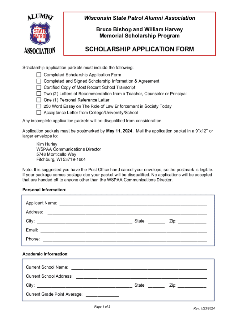 Wisconsin State Patrol Alumni Association Bruce Bishop and William Harvey Memorial Scholarship ProgramSCHOLARSHIP APPLICATION FORM Scholarship application packets must include the following: Completed