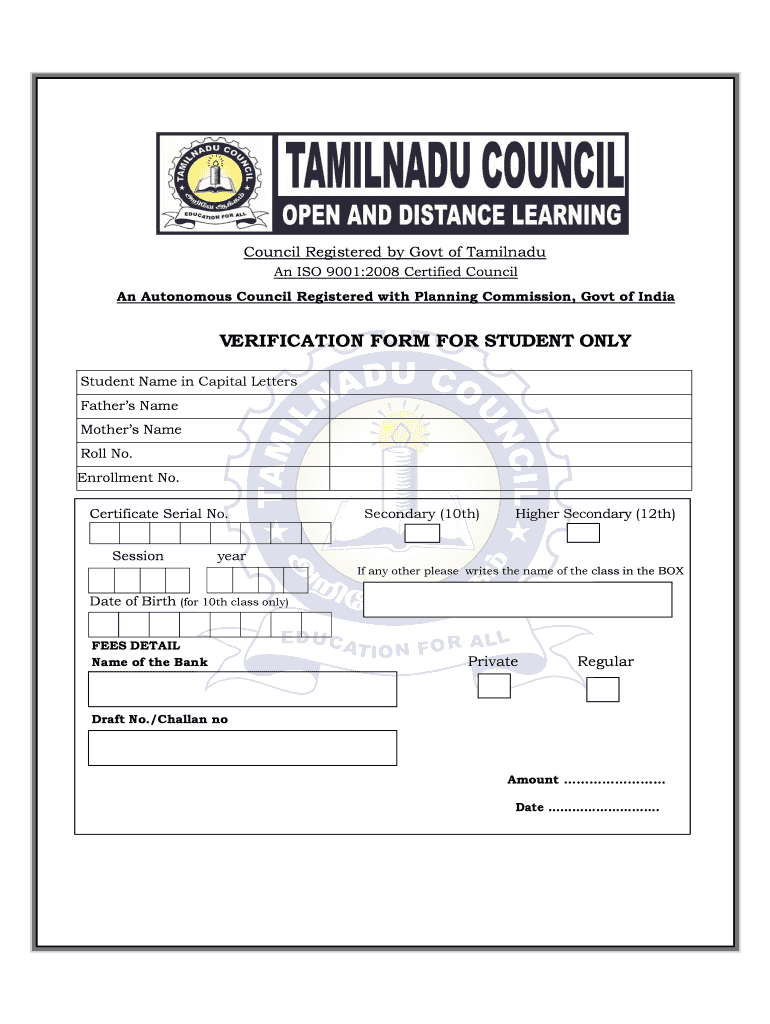 Council Registered by Govt of Tamil Nadu An ISO 9001:2008 Certified Council An Autonomous Council Registered with Planning Commission, Govt of India VERIFICATION FORM FOR STUDENT ONLY Student Name