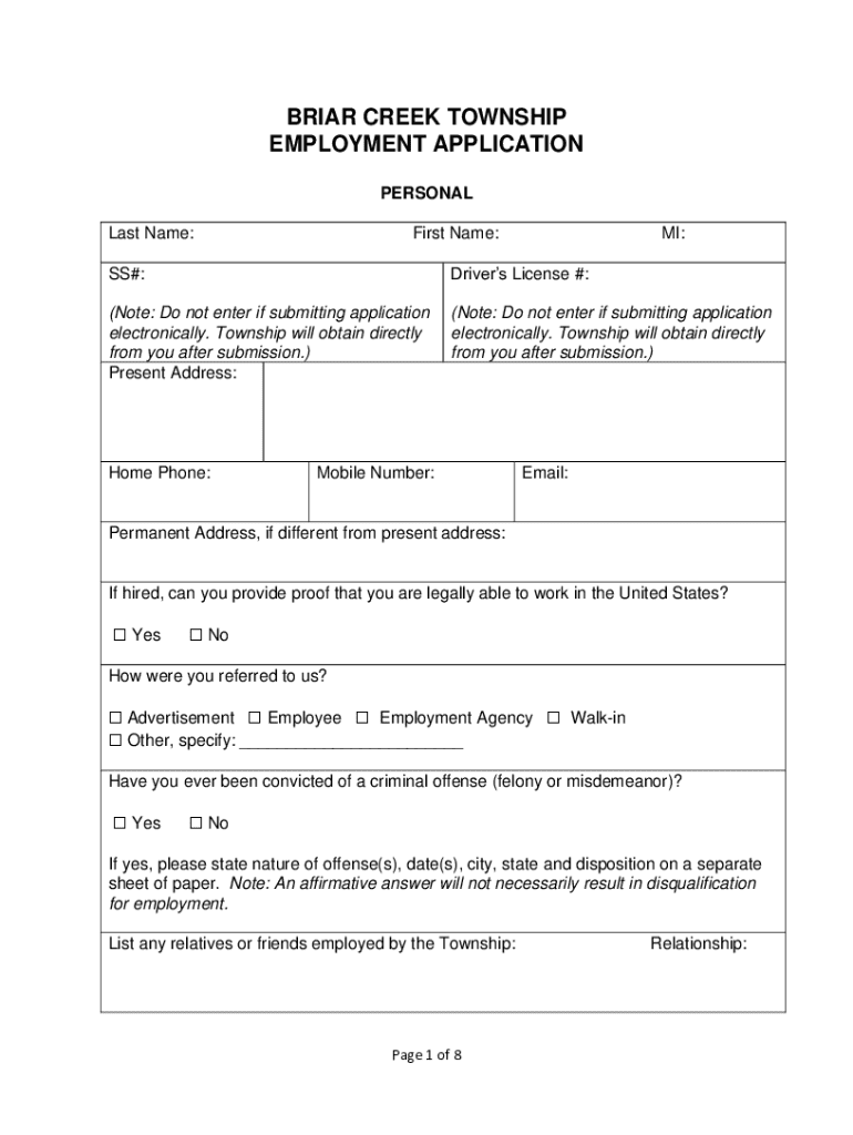 BRIAR CREEK TOWNSHIP EMPLOYMENT APPLICATION PERSONAL Last Name:First Name:MI:SS#:Drivers License #:(Note: Do not enter if submitting application electronically. Township will obtain directly from