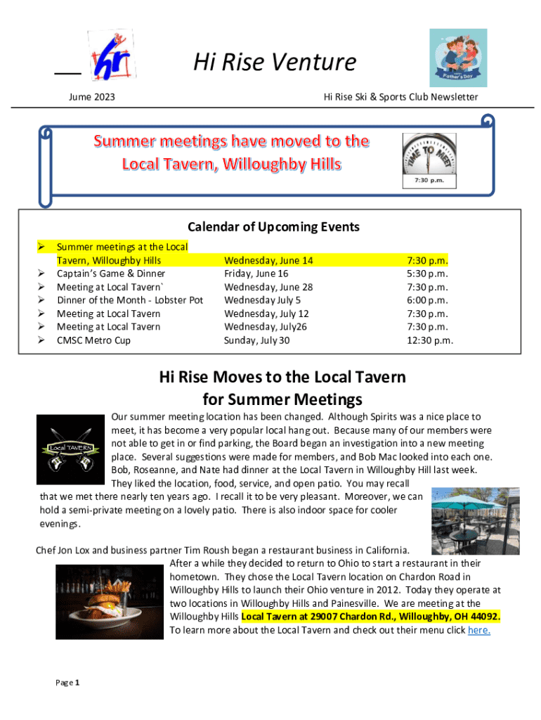 Hi Rise Venture June 2023Hi Rise Ski & Sports Club NewsletterCalendar of Upcoming Events Summer meetings at the Local Tavern, Willougbhy Hills Captains Game & Dinner Meeting at Local Tavern` Dinner