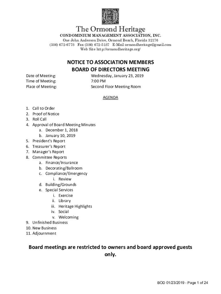 The Ormond HeritageCONDOMINIUM MANAGEMENT ASSOCIATION, INC. One John Anderson Drive, Ormond Beach, Florida 32176 (386) 6726778 Fax (386) 6725187 EMail ormondheritage@gmail.com Web Site http://ormondheritage.org/Date