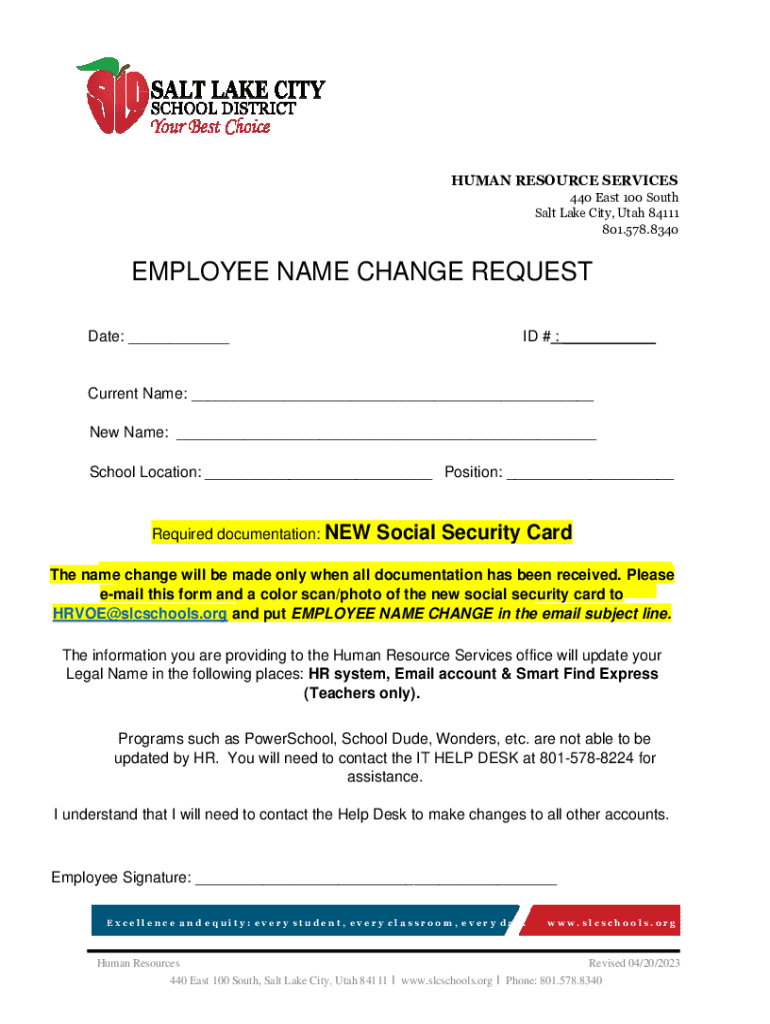 HUMAN RESOURCE SERVICES 440 East 100 South Salt Lake City, Utah 84111 801.578.8340EMPLOYEE NAME CHANGE REQUEST Date: ___ID # : ___Current Name: ___ New Name: ___ School Location: ___ Position: ___Required documentation: NEWSocial Security CardThe name change will be made only when all documentation has been received. Please email this form and a color scan/photo of the new social security card to HRVOE@slcschools.org and put EMPLOYEE NAME CHANGE in the email subject line. The information