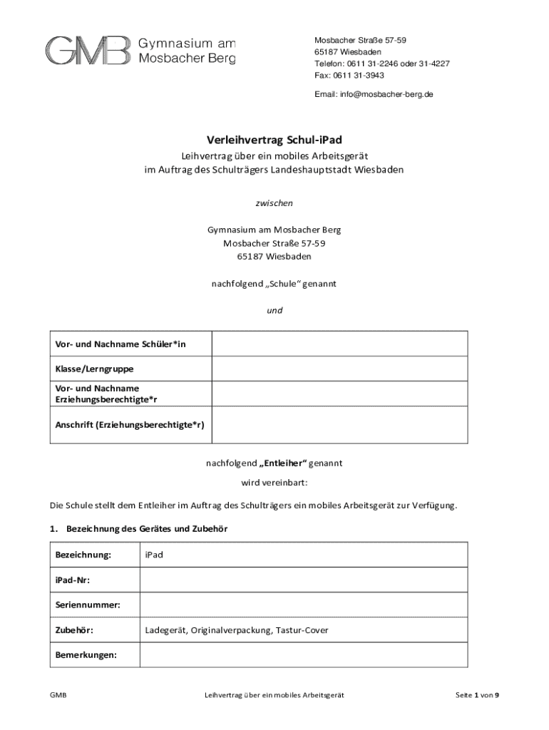 Mosbacher Strae 5759 65187 Wiesbaden Telefon: 0611 312246 oder 314227 Fax: 0611 313943 Email: info@mosbacherberg.deVerleihvertrag SchuliPad Leihvertrag ber ein mobiles Arbeitsgert im Auftrag des Schultrgers
