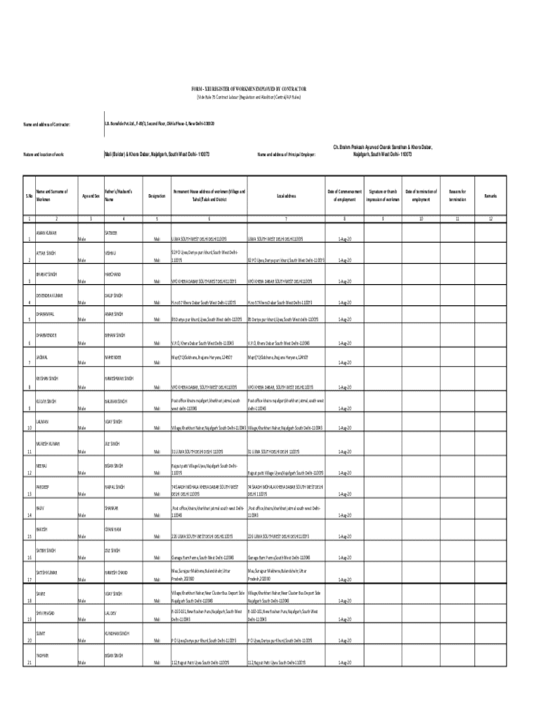 FORM XIII REGISTER OF WORKMEN EMPLOYED BY CONTRACTOR [Vide Rule 75 Contract Labour (Regulation and Abolition) Central/A.P Rules)Name and address of Contractor:L.B. Bonafide Pvt.Ltd., F89/3, Second