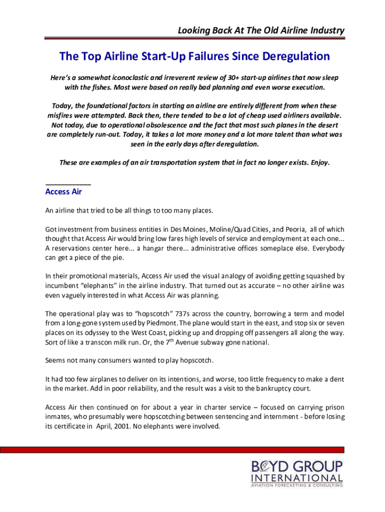 Looking Back At The Old Airline Industry Top Airline Startup Failures Since Deregulation Here's a somewhat iconoclastic and irreverent review of 30+ startup airlines that now sleep with the fishes.
