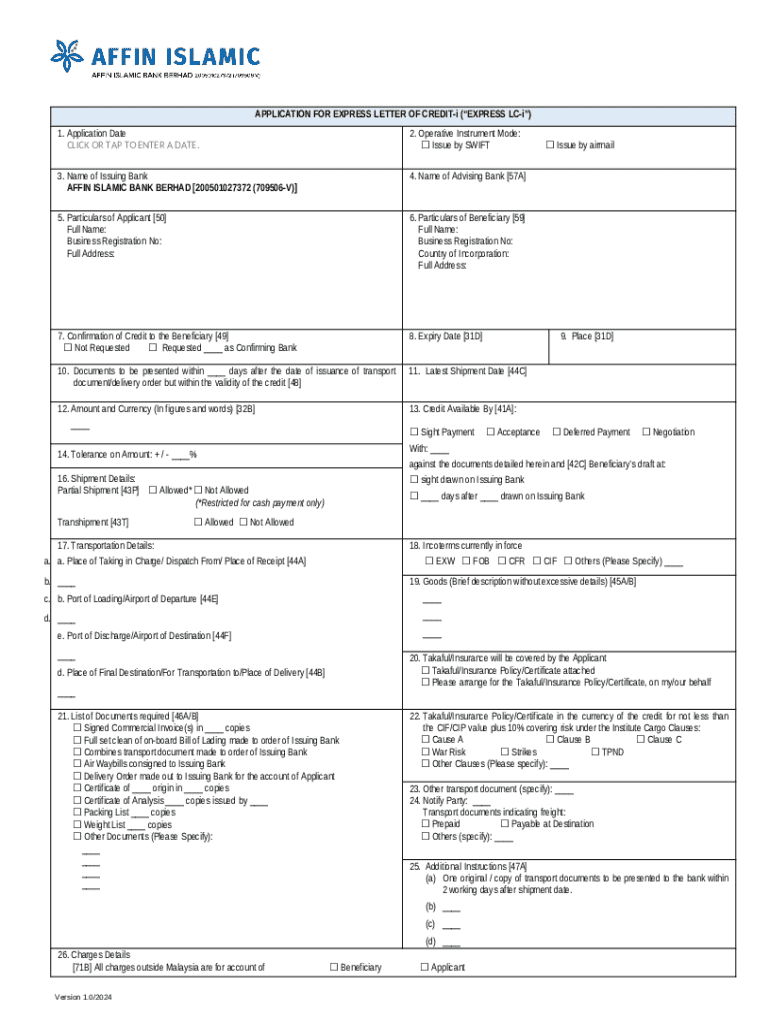 The Express LC-iApplication /Version 1.0/2024 is a Word document that should be submitted to the specific address to provide specific information. It must be completed and signed, which can be done manually, or with a certain solution like PDFfiller. This tool allows to complete any PDF or Word document right in the web, customize it depending on your needs and put a legally-binding electronic signature. Once after completion, the user can easily send the Express LC-iApplication /Version 1.0/2024 to the relevant recipient, or multiple ones via email or fax. The editable template is printable too because of PDFfiller feature and options offered for printing out adjustment. Both in electronic and in hard copy, your form should have a clean and professional appearance. You can also turn it into a template to use later, there's no need to create a new blank form over and over. All you need to do is to customize the ready sample.