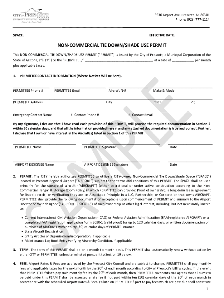 6630 Airport Ave, Prescott, AZ 86301 Phone: (928) 7771114SPACE: ___EFFECTIVE DATE: ___NONCOMMERCIAL TIE DOWN/SHADE USE PERMIT This NONCOMMERCIAL TIE DOWN/SHADE USE PERMIT (PERMIT) is issued by the City of Prescott, a Municipal Corporation of the State of Arizona, (CITY,) to the PERMITTEE, ___, at a rate of ___ per month plus applicable taxes. 1.PERMITTEE CONTACT INFORMATION (Where Notices Will Be Sent).PERMITTEE Phone #PERMITTEE EmailAircraft N#PERMITTEE Address Emergency Contact NameMake &...