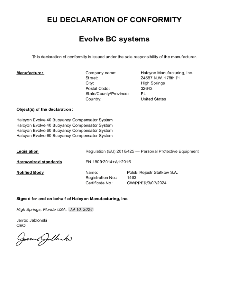 EU DECLARATION OF CONFORMITY Evolve BC systems This declaration of conformity is issued under the sole responsibility of the manufacturer. ManufacturerCompany name: Street: City: Postal Code: State/County/Province: