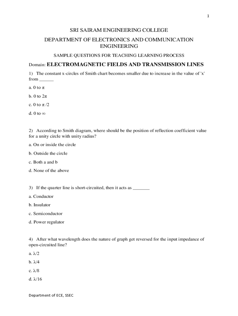 1SRI SAI RAM ENGINEERING COLLEGE DEPARTMENT OF ELECTRONICS AND COMMUNICATION ENGINEERING SAMPLE QUESTIONS FOR TEACHING LEARNING PROCESS Domain: ELECTROMAGNETIC FIELDS AND TRANSMISSION LINES 1) The