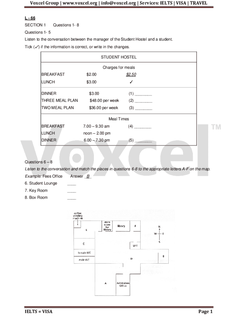 Voxcel Group | www.voxcel.org | info@voxcel.org | Services: IELTS | VISA | TRAVEL L 66 SECTION 1Questions 1 8Questions 1 5 Listen to the conversation between the manager of the Student Hostel and