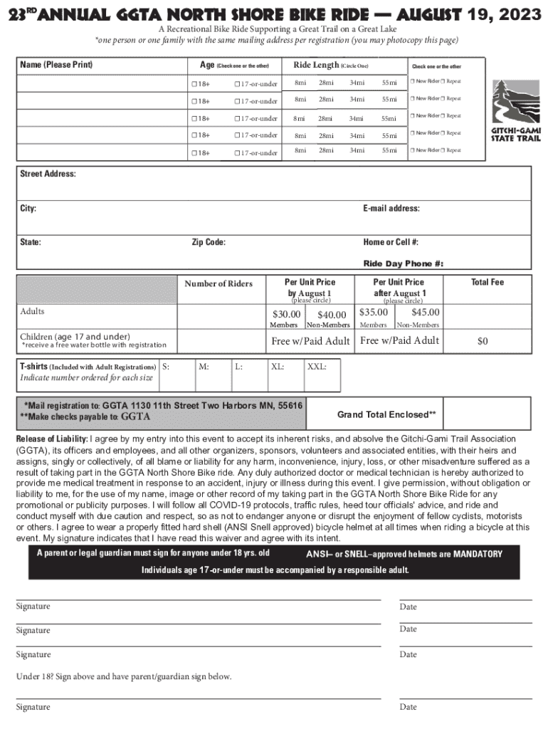 23rdannual GGTA North Shore Bike Ride August 19, 2023 A Recreational Bike Ride Supporting a Great Trail on a Great Lake *one person or one family with the same mailing address per registration (you