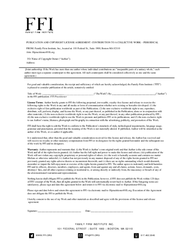 The Family Firm Institute Form is a crucial document designed for families that are involved in business operations. This form serves as a foundational tool that aids in documenting essential aspects of family businesses, such as governance structures and succession plans. Properly utilizing this form can significantly influence how family firms manage transitions and maintain effective governance, ensuring the longevity and health of the family business across generations.