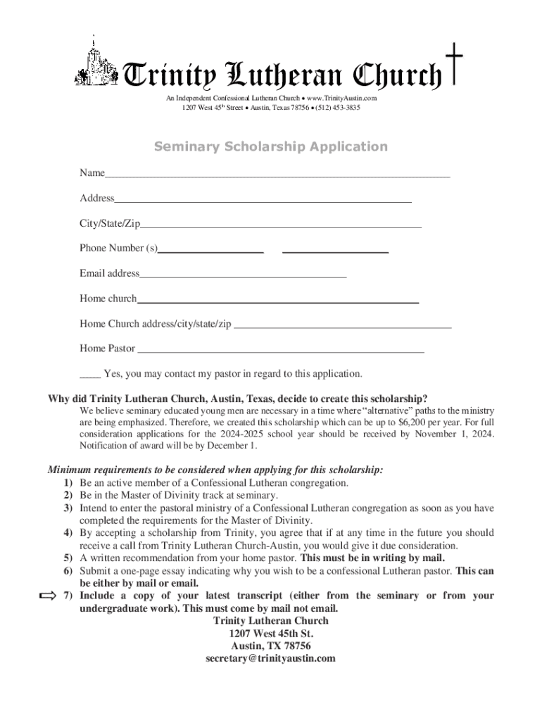 Get the free Seminary Scholarship Application Trinity Lutheran Church