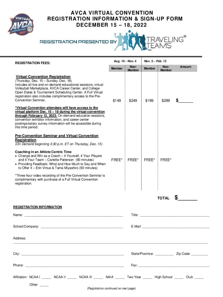 Understanding the registration packages and pricing for the AVCA Annual Convention is crucial for both individuals and teams looking to participate. This year, the convention offers several registration options designed to cater to diverse needs and budgets.