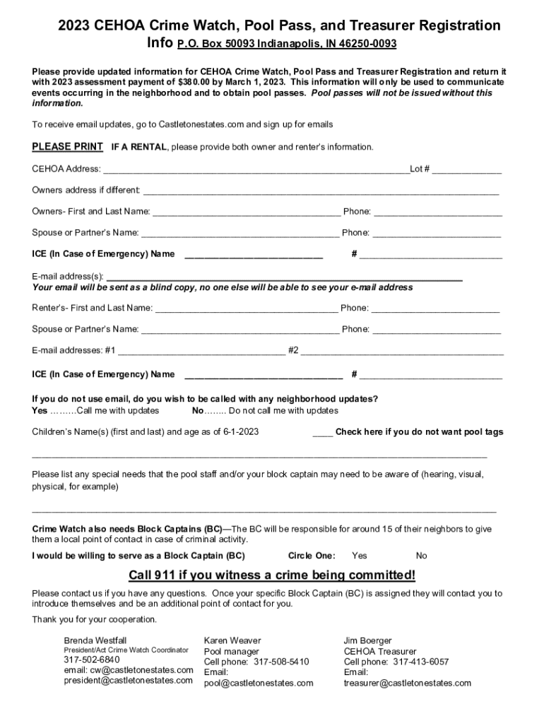Get the free 2023 CEHOA Crime Watch, Pool Pass, and Treasurer Registration
