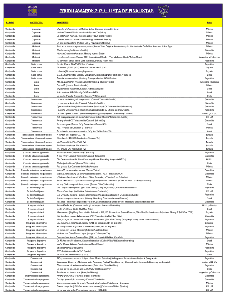 PRODU AWARDS 2020 LISTA DE FINALISTAS RUBROCATEGORANOMINADOPASContenidoCpsulasEl poder de los nombres (Mobius. Lab y Cisneros Group/Lifetime)MxicoContenidoCpsulasHarina (ViacomCBS International Studios/YouTube)MxicoContenidoCpsulasLa