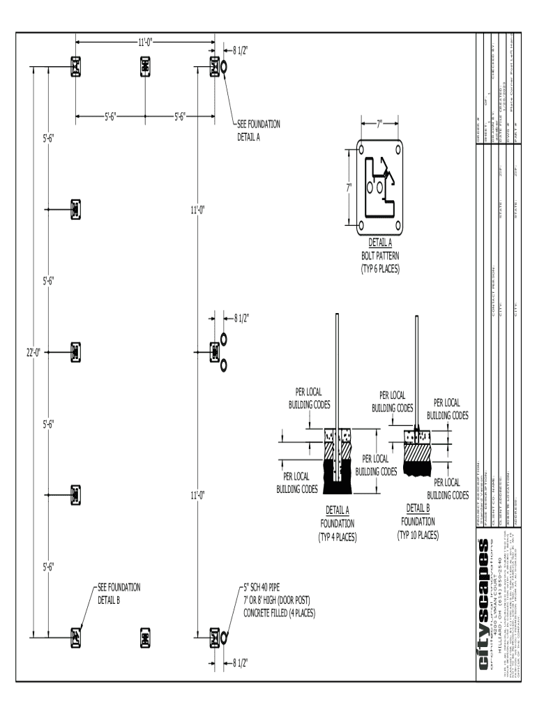 SEE FOUNDATION DETAIL B 11\'0\"11\'0\"8 1/2\"PER LOCAL BUILDING CODESPER LOCAL BUILDING CODES5\'6\" 5\" SCH 40 PIPE 7\' OR 8\' HIGH (DOOR POST) CONCRETE FILLED (4 PLACES)PER LOCAL BUILDING CODES5\'6\"