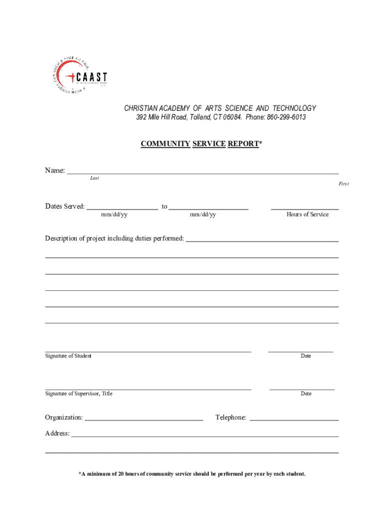 CHRISTIAN ACADEMY OF ARTS SCIENCE AND TECHNOLOGY 392 Mile Hill Road, Tolland, CT 06084. Phone: 8602996013COMMUNITY SERVICE REPORT*Name: Last FirstDates Served:to mm/dd/yymm/dd/yyHours of ServiceDescription of project including duties performed:___ Signature of Student___ Date___ Signature of Supervisor, Title___ DateOrganization:Telephone:Address:*A minimum of 20 hours of community service should be performed per year by each student.