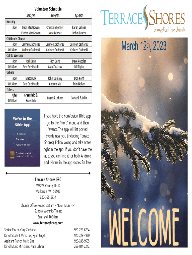 Volunteer Schedule March 12th, 2023If you have the Conversion Bible app, go to the more menu and then events. The app will list posted events near you (including Terrace Shores). Follow along and