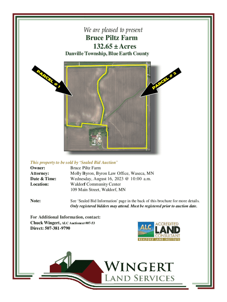 We are pleased to presentBruce Piltz Farm 132.65 Acres Danville Township, Blue Earth CountyThis property to be sold by Sealed Bid Auction Owner: Bruce Piltz Farm Attorney: Molly Byron, Byron Law Office,