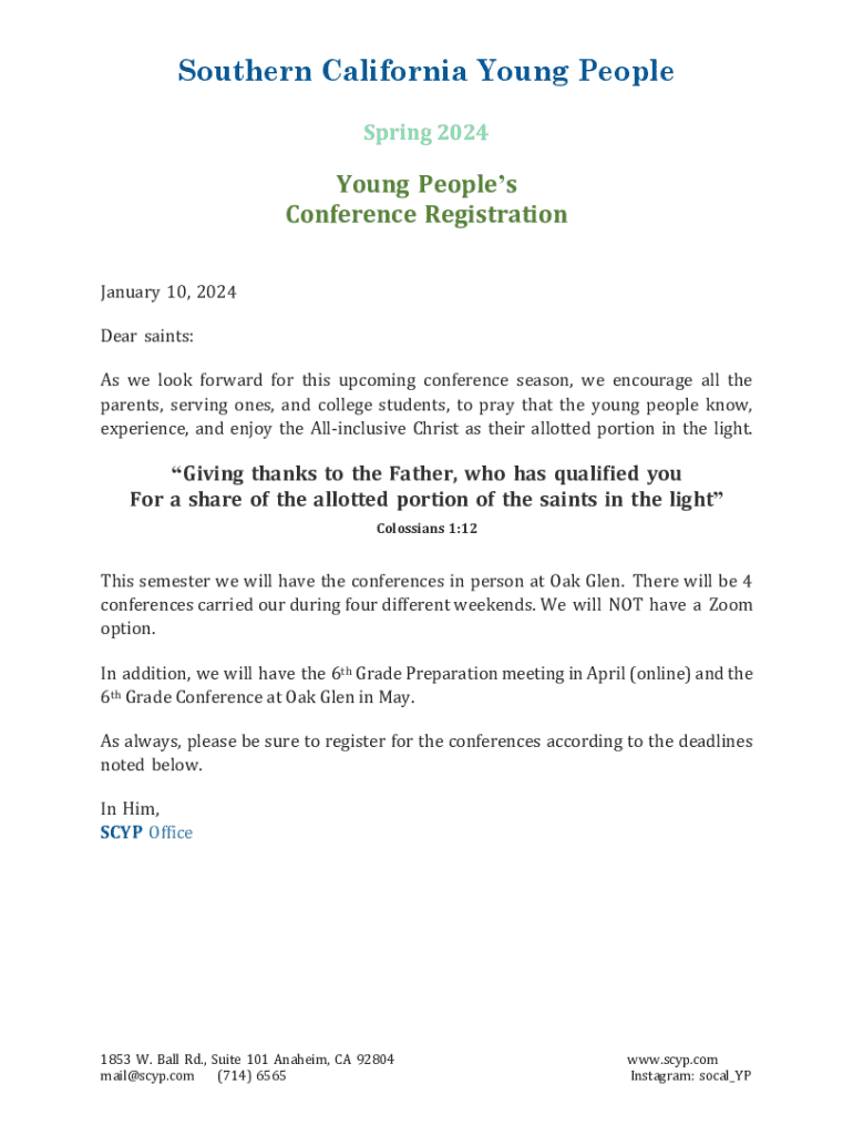 Southern California Young People Spring 2024Young Peoples Conference Registration January 10, 2024 Dear saints: As we look forward for this upcoming conference season, we encourage all the parents, serving ones, and college students, to pray that the young people know, experience, and enjoy the Allinclusive Christ as their allotted portion in the light.Giving thanks to the Father, who has qualified you For a share of the allotted portion of the saints in the light Colossians 1:12This