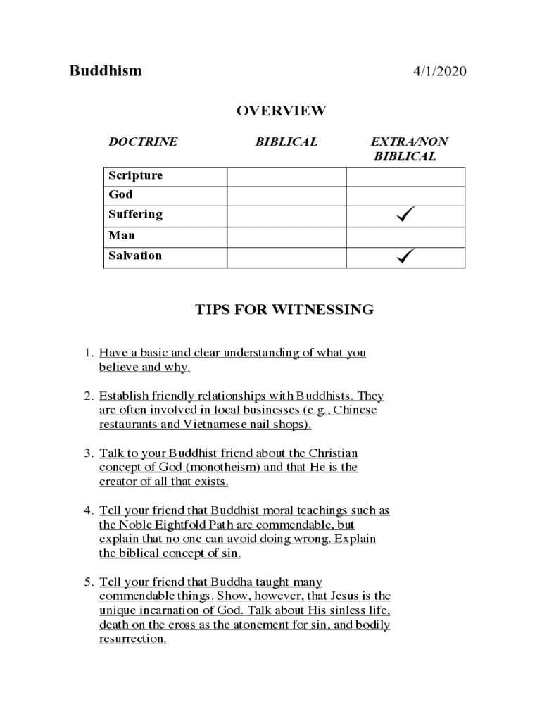 Buddhism4/1/2020OVERVIEW DOCTRINEBIBLICALEXTRA/NON BIBLICALScripture God Suffering Man SalvationTIPS FOR WITNESSING 1. Have a basic and clear understanding of what you believe and why. 2. Establish friendly relationships with Buddhists. They are often involved in local businesses (e.g., Chinese restaurants and Vietnamese nail shops). 3. Talk to your Buddhist friend about the Christian concept of God (monotheism) and that He is the creator of all that exists. 4. Tell your friend that Buddhist