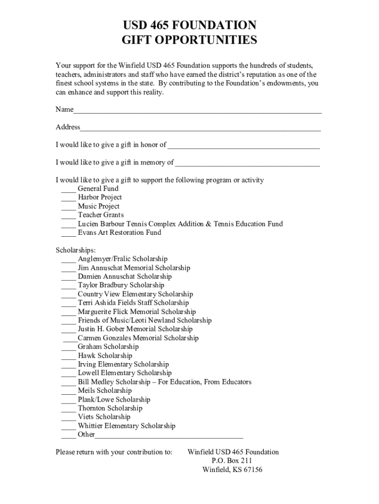 USD 465 FOUNDATION GIFT OPPORTUNITIES Your support for the Winfield USD 465 Foundation supports the hundreds of students, teachers, administrators and staff who have earned the districts' reputation