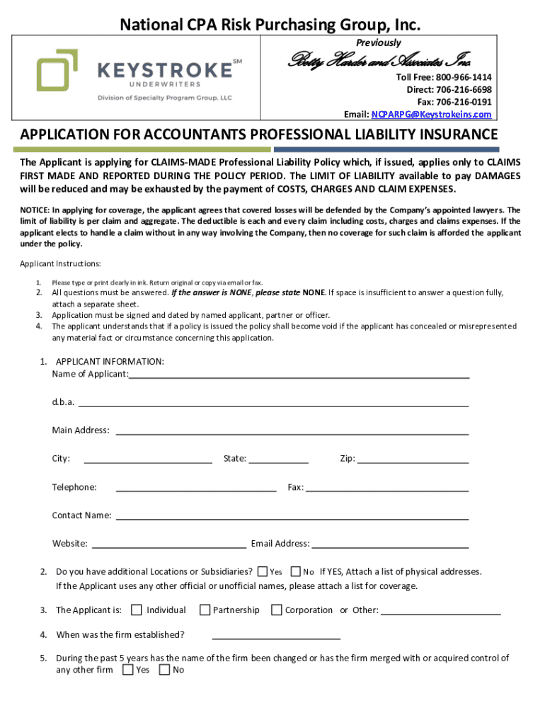 National CPA Risk Purchasing Group, Inc. Previously Betty Harder and Associates, Inc. Toll Free: 8009661414 Direct: 7062166698 Fax: 7062160191 Email: NCPARPG@Keystrokeins.comAPPLICATION FOR ACCOUNTANTS