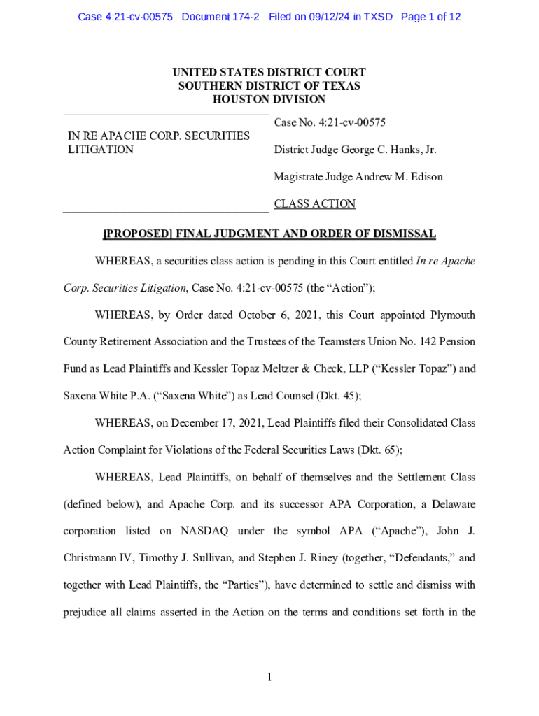 Case 4:21cv00575 Document 1742 Filed on 09/12/24 in TXSD Page 1 of 12UNITED STATES DISTRICT COURT SOUTHERN DISTRICT OF TEXAS HOUSTON DIVISION Case No. 4:21cv00575 IN RE APACHE CORP. SECURITIES LITIGATIONDistrict