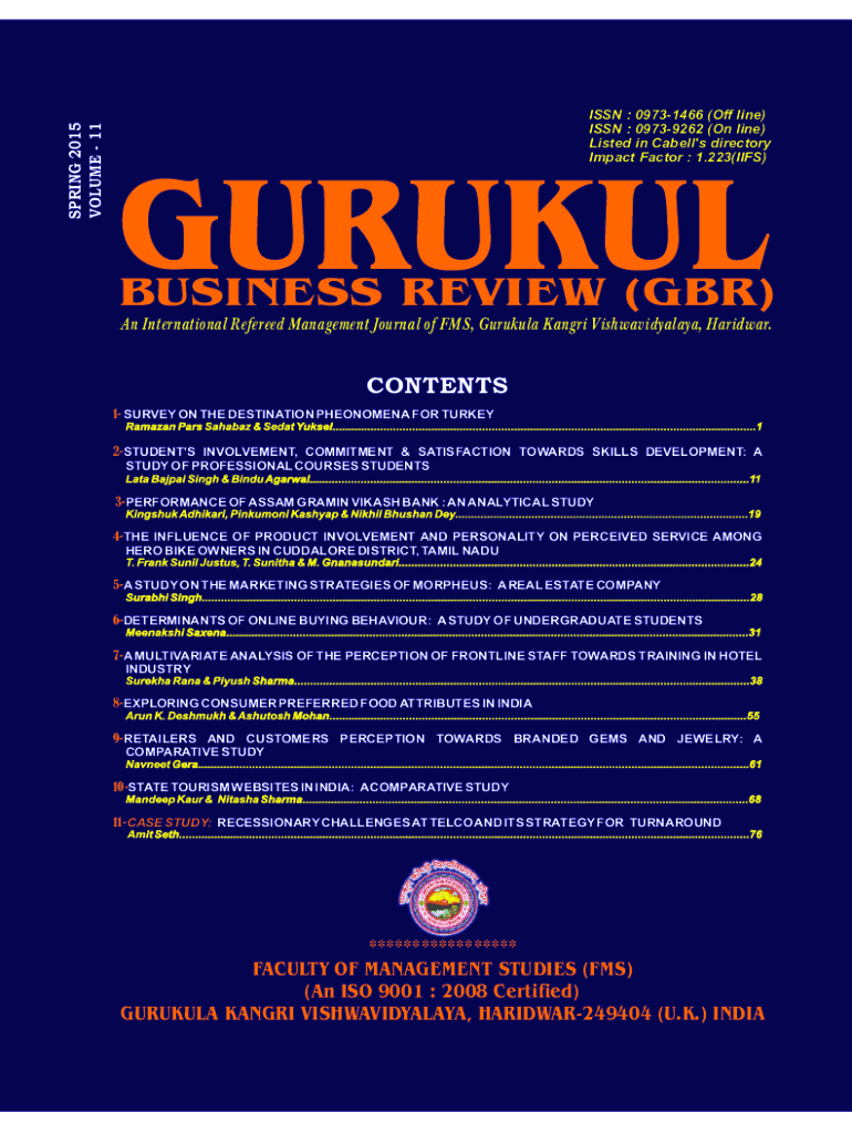 SPRING 2015 VOLUME 11ISSN : 09731466 (Off line) ISSN : 09739262 (On line) Listed in Cabell\'s directory Impact Factor : 1.223(IIFS)GURUKULBUSINESS REVIEW (GBR) An International Refereed Management Journal of FMS, Gurukula Kangri Vishwavidyalaya, Haridwar.CONTENTS 1 SURVEY ON THE DESTINATION PHEONOMENA FOR TURKEY Ramazan Pars Sahabaz & Sedat Yuksel.....................................................................................................................................12STUDENT\'S