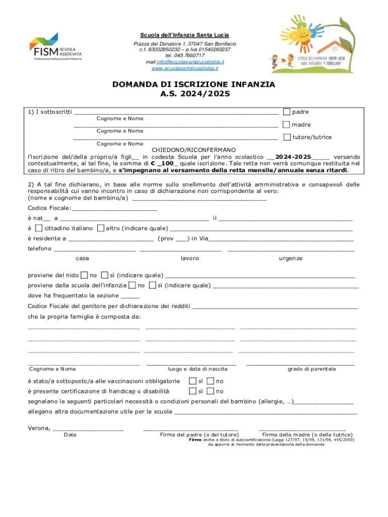 Nella domanda di iscrizione alla scuola infanzia Santa Lucia devono essere riportati dati personali del bambino, informazioni sui genitori, eventuali esigenze particolari e altre informazioni richieste dalla scuola.