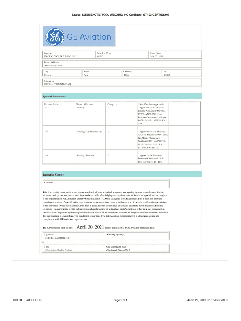 Source: 62565 EXOTIC TOOL WELDING INC Certificate: GT193CERT006197SupplierSupplier CodeIssue DateEXOTIC TOOL WELDING INC62565Mar 25, 2019Street Address 2909 Seaway BlvdCityStateCountryZipEverettWAUSA98203Attention: HICKOK, TIM [NN500AT]Special Processes: Process CodeName of ProcessCategoryCDBrazing2Specification Approvals Approved for Torch (Gas) Brazing (CD02) per M50T1, P9TF1, ANSI/AWSC3.4; Induction Brazing (CD03) per P9TF1, M50T1, ANSI/AWS C3.5.CFWelding,