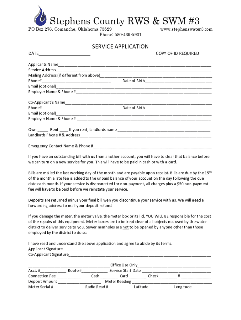 Stephens County ROWS & SUM #3 PO Box 276, Comanche, Oklahoma 73529 Phone: 5804395931www.stephenswater3.service APPLICATION DATE___COPY OF ID REQUIREDApplicants Name___ Service Address___ Mailing Address