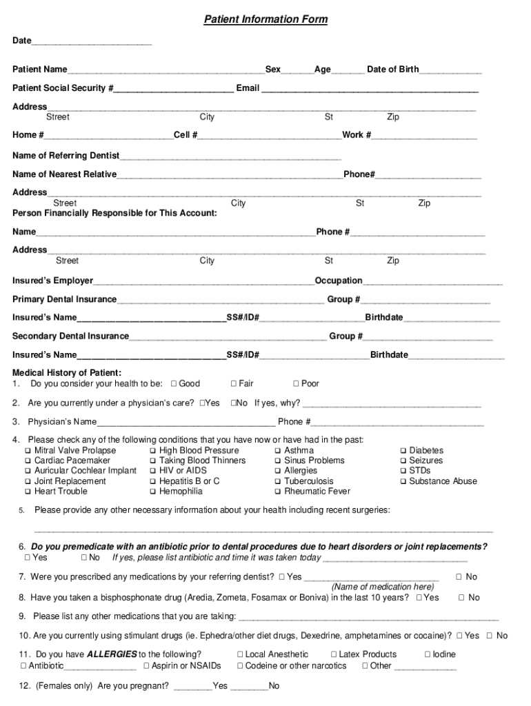 Patient Information Form Date___ Patient Name___Sex___Age___ Date of Birth___ Patient Social Security #___ Email ___ Address___ Street City St Zip Home #___Cell #___Work #___ Name of Referring Dentist___ Name of Nearest Relative___Phone#___ Address___ Street City St Zip Person Financially Responsible for This Account: Name___Phone #___ Address___ Street City St Zip Insureds Employer___Occupation___ Primary Dental Insurance___ Group #___ Insureds Name___SS#/ID#___Birthdate___ Secondary Dental