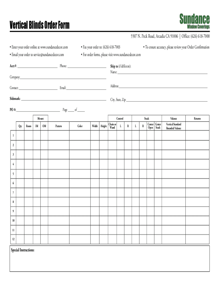 Vertical Blinds Order Form 5507 N. Peck Road, Arcadia CA 91006 | Office: (626) 6187000 Enter your order online at www.sundancedecor.com Fax your order to: (626) 6187003 Email your order to service@sundancedecor.com For order forms, please visit www.sundancedecor.comAcct #: ___ Phone: ___ To ensure accuracy, please review your Order ConfirmationShip to (if different): Name: ___Company:___ Contact: ___ Email: ___Address: ___Sidemark: ___City, State, Zip: ___PO