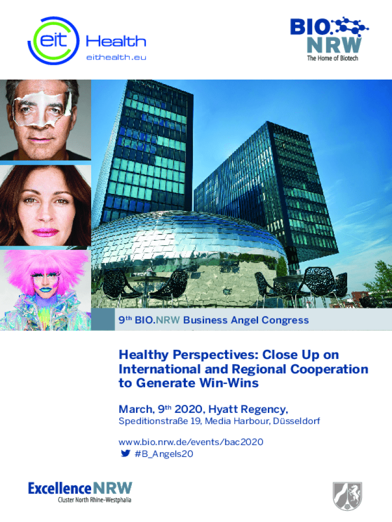 eithealth.eu9th BIO.NRW Business Angel CongressHealthy Perspectives: Close Up on International and Regional Cooperation to Generate WinWins March, 9th 2020, Hyatt Regency, Speditionstrae 19, Media Harbour, Dsseldorf www.bio.nrw.de/events/bac2020 #B_Angels2011:00Guided Exhibition Tour (Meeting Point: Foyer NRWForum) Martin Schoeller is a New Yorkbased photographer whose style of hyperdetailed close ups is distinguished by similar treatment of all subjects whether they are celebrities