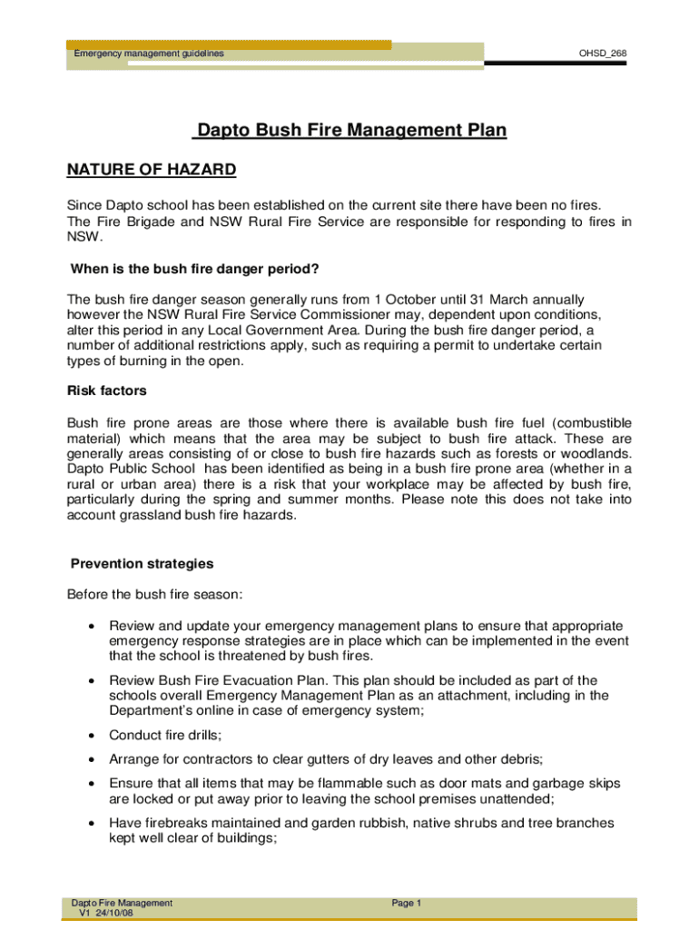 Emergency management guidelinesOHSD_268Dapto Bush Fire Management Plan NATURE OF HAZARD Since Dapto school has been established on the current site there have been no fires. The Fire Brigade and NSW