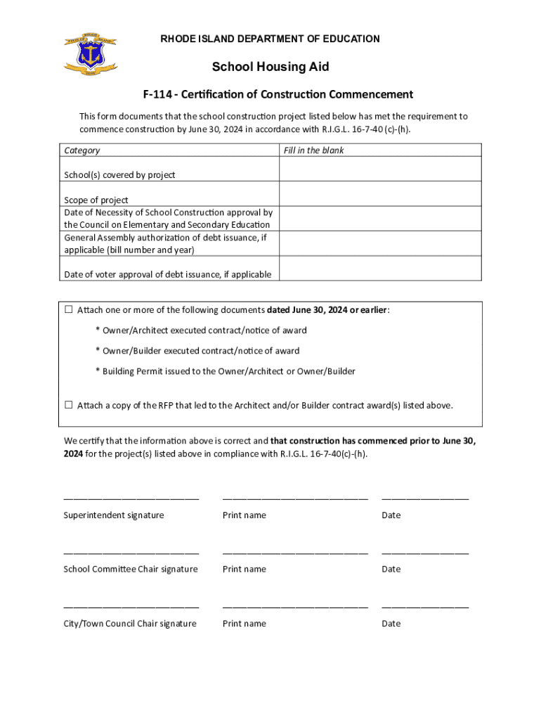 F114 Certification of Construction Commencement