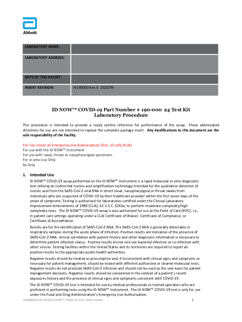 LABORATORY NAME: LABORATORY ADDRESS:DATE OF THIS PACKET: INSERT REVISION:IN190000 Rev.6 2020/09ID NOW COVID19 Part Number # 190000 24 Test Kit Laboratory Procedure This procedure is intended to provide