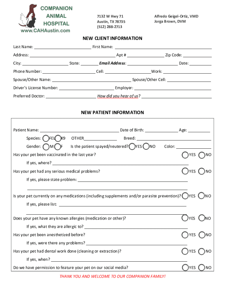 Alfredo GeigelOrtiz, VMD Jorga Brown, DVM7132 W Hwy 71 Austin, TX 78735 (512) 2882713NEW CLIENT INFORMATION Last Name: ___ First Name: ___ Address: ___ Apt # ___ Zip Code: ___ City: ___ State: ___ Email Address: ___ Date: ___ Phone Number: ___ Cell: ___Work: ___ Spouse/Other Name: ___ Spouse/Other Cell: ___ Drivers License Number: ___ Employer: ___ Preferred Doctor: ___ How did you hear of us? ___NEW PATIENT INFORMATION Patient Name: ___ Date of Birth: ___ Age: ___ Species:FELK9OTHER___Breed: